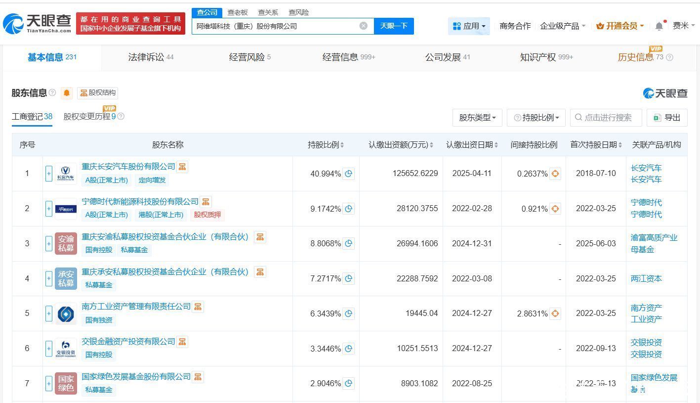 阿维塔科技(重庆)股份有限公司成立于2018年7月,法定代表人为陈卓,注册资本约30.7亿人民币,经营范围包括第二类增值电信业务、道路机动车辆生产、小微型客车租赁经营服务等。股东信息显示,该公司由长安汽车(000625)、宁德时代(300750)、南方工业资产管理有限责任公司等共同持股。