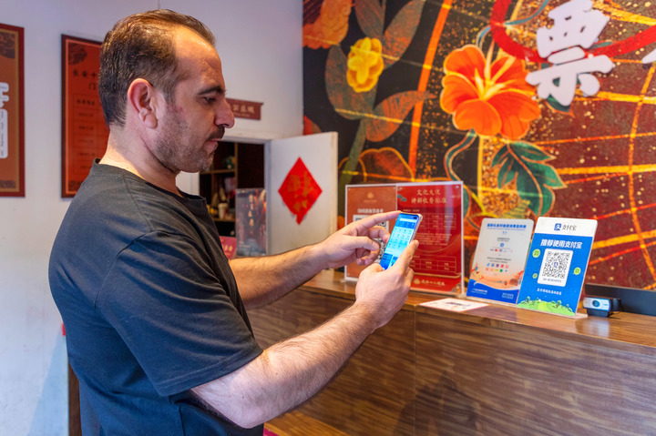 外国游客在西安景区体验支付宝扫码支付服务。新华社记者李一博摄